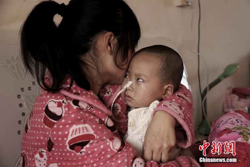 孩子的妈妈每隔3个小时左右,用针管将牛奶注入孩子的胃管中,不时将呼吸困难憋得直翻白眼的孩子扶起来拍拍后背,看着孩子这样受罪,熊大哥夫妇整日以泪洗面。