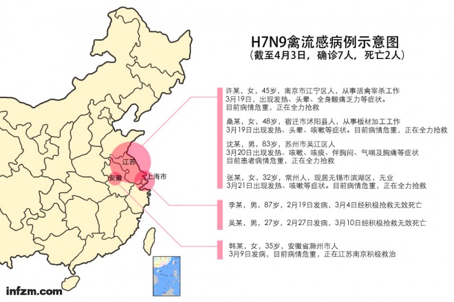 截止4月3日早上,我国大陆境内共发现7例人感染H7N9禽流感病例,其中上海2人死亡,安徽滁州市的1例和江苏省4例病人病情危重,正在全力抢救。江苏省4月3日早上公布了16家人感染H7N9禽流感病例首批定点收治医院名单。