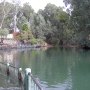 约旦河是条安静的小河,远不如耶稣时代那样宽阔。洗礼圣址(Yardenit)两岸桉树围绕,两岸花藤成片。窄窄的河道,浅浅的河水一眼就可以望到底。平静的河水几乎感觉不到流动。只有小鱼在水里游动的时候,才给水面带来些许的涟漪。岸边竖着一块木牌,上面用英文和希伯来文写着“耶稣基督受洗处”。河边有专为信徒念诵圣经的台阶,河里有几道金属做的扶栏。