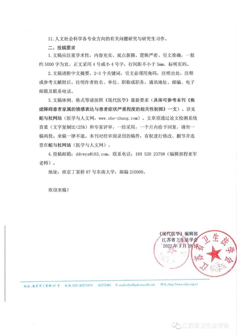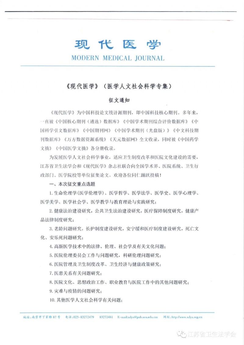 为发展医学人文社会科学事业,并适应卫生制度改革和医院文化建设的需要,江苏省卫生法学会、《现代医学》杂志社联合向全国学术界、医院系统、卫生行政部门、医学院校等单位征集论文,欢迎各位同仁踊跃投稿。