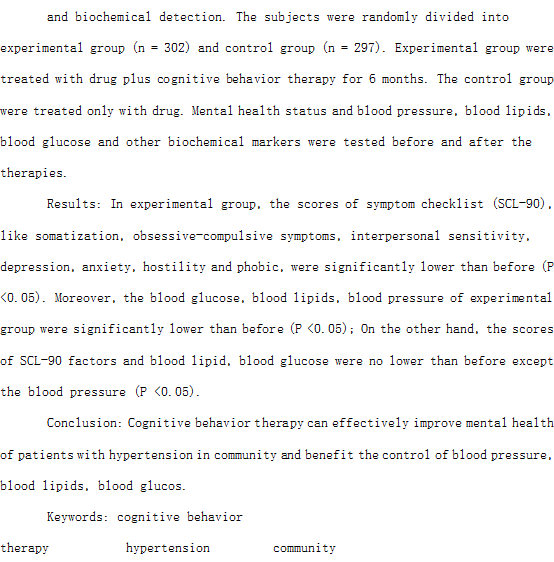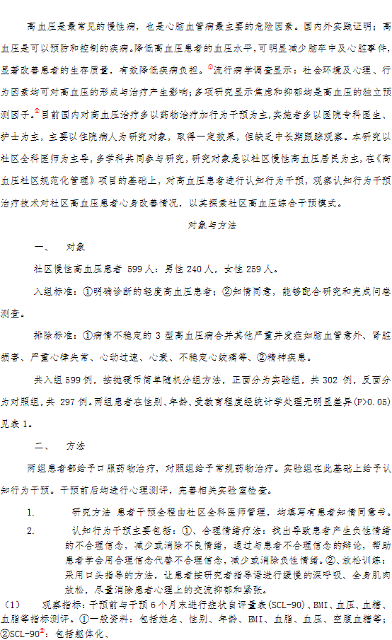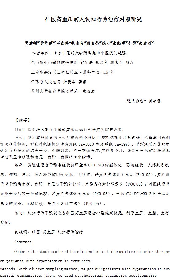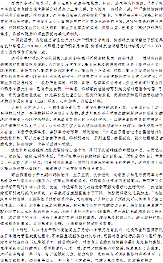 吴建强 黄华磊等:社区高血压病人认知行为治疗对照研究